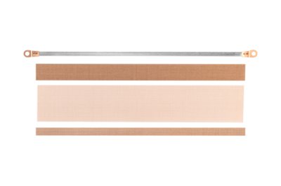 ヒーター、フッ素樹脂絶縁シート(ヒーター上部)、フッ素樹脂絶縁粘着テープ(ヒーター下部)、カッター刃があります。